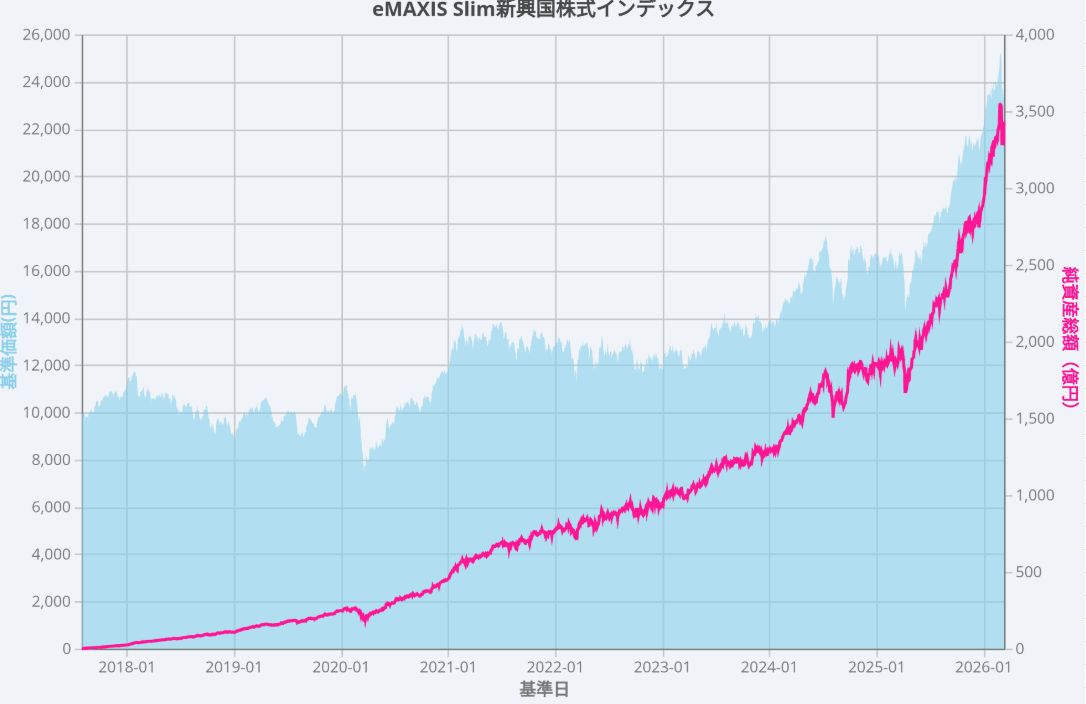eMAXIS Slim新興国株式インデックスは、三菱UFJアセットマネジメントのインデックスファンド・シリーズの投資信託です。新興国の株式市場を投資対象としている銘柄で、2026年1月30日時点で純資産総額は3,267.72億円を突破しています。