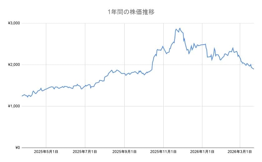 2025年3月から1年間の調整後終値は、1,200円〜2,800円台で推移しました。2025年4月2日に最安値1,220円を記録した後、上昇基調に転じ、昨年11月27日には最高値2,877.5円に到達。しかし以降はツルハホールディングスの連結子会社化に伴う巨額の資金負担と、それに伴う財務悪化への懸念が市場で強く意識されます。12月は利益確定売りなどで軟調な展開が続き、徐々に値を切り下げています。